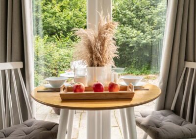 - Dining area: with table; two chairs; next to the French doors leading out to the patio area.
