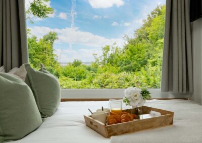 - Bedroom: with double bed; wall-mounted Freeview TV; and large picture window from which to watch the sunrise. The bed will be made up for you with luxury linens, and towels are also provided.