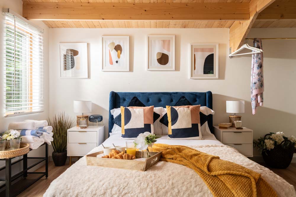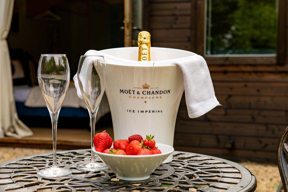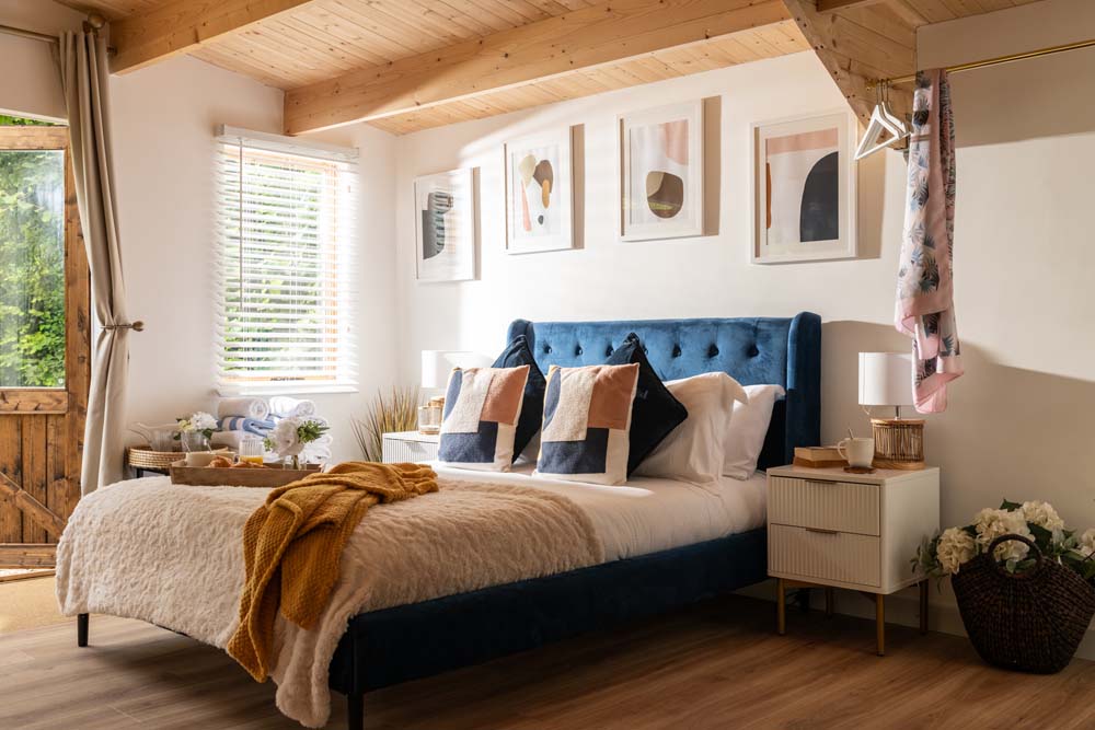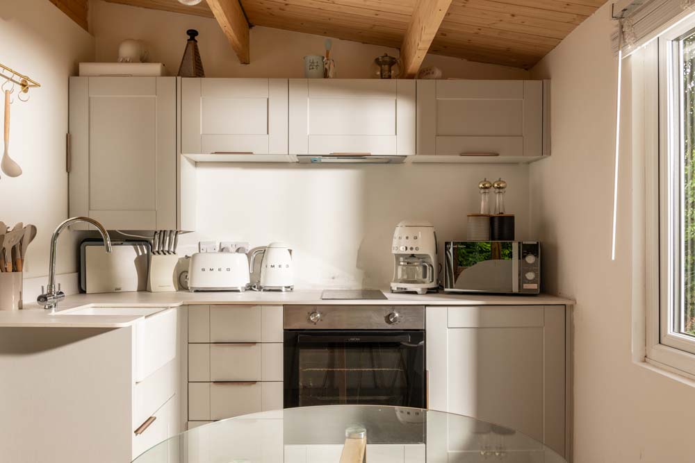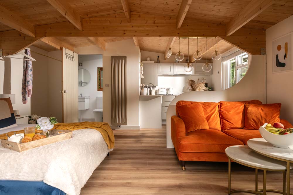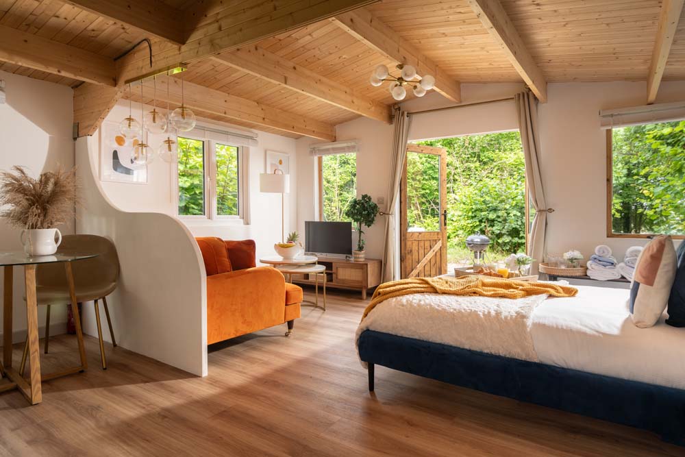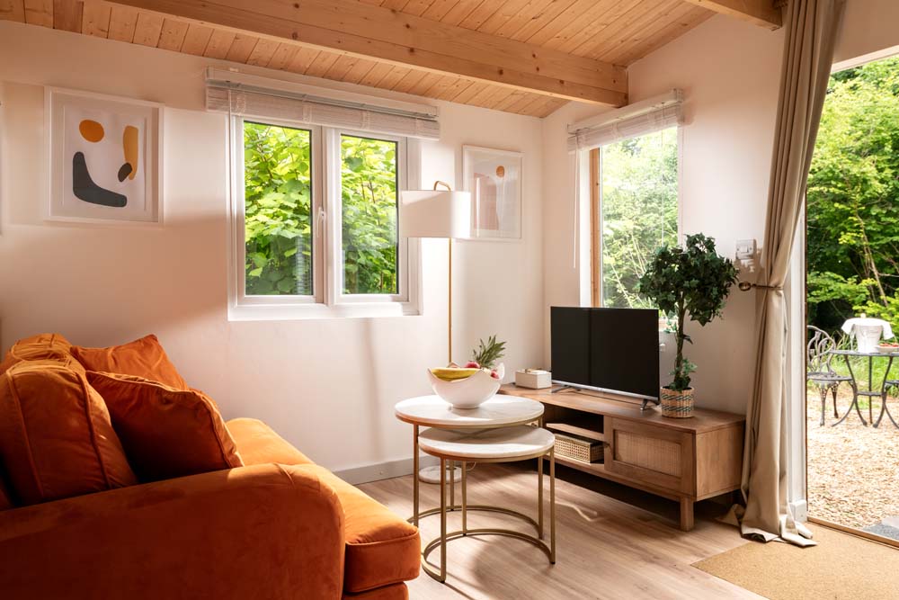 Inside, get cosy in front of the TV on the squishy, velvet sofa. Or snuggle up in the comfy double bed. You can admire the views of the trees from the windows or throw open the doors that lead to the beautiful, secluded garden to get a better view. Outside is where you’ll also find the hot tub.