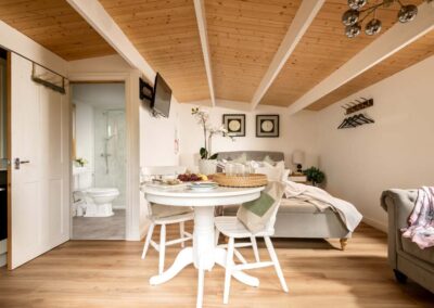 - Bedroom area: with plush double bed and ottoman. The bed will be made up with luxury bedding for you.