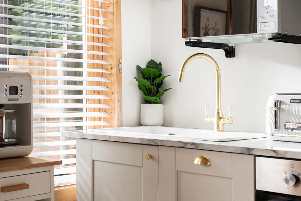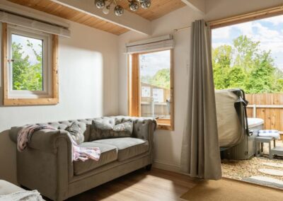 - Living area: with gorgeous velvet sofa and Freeview TV.