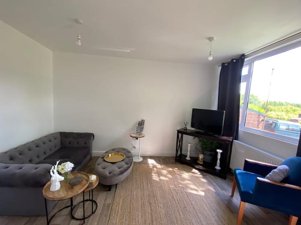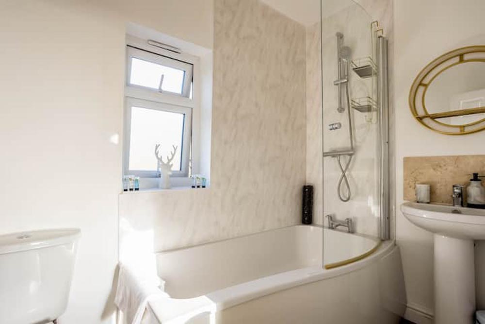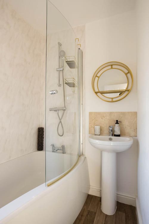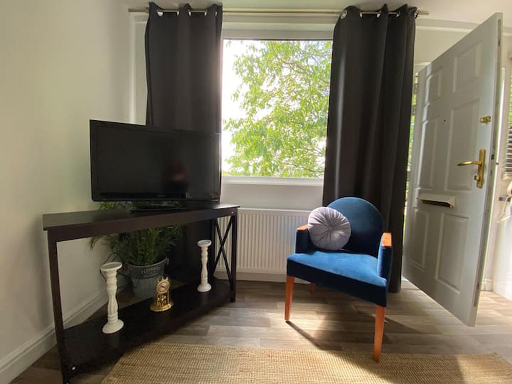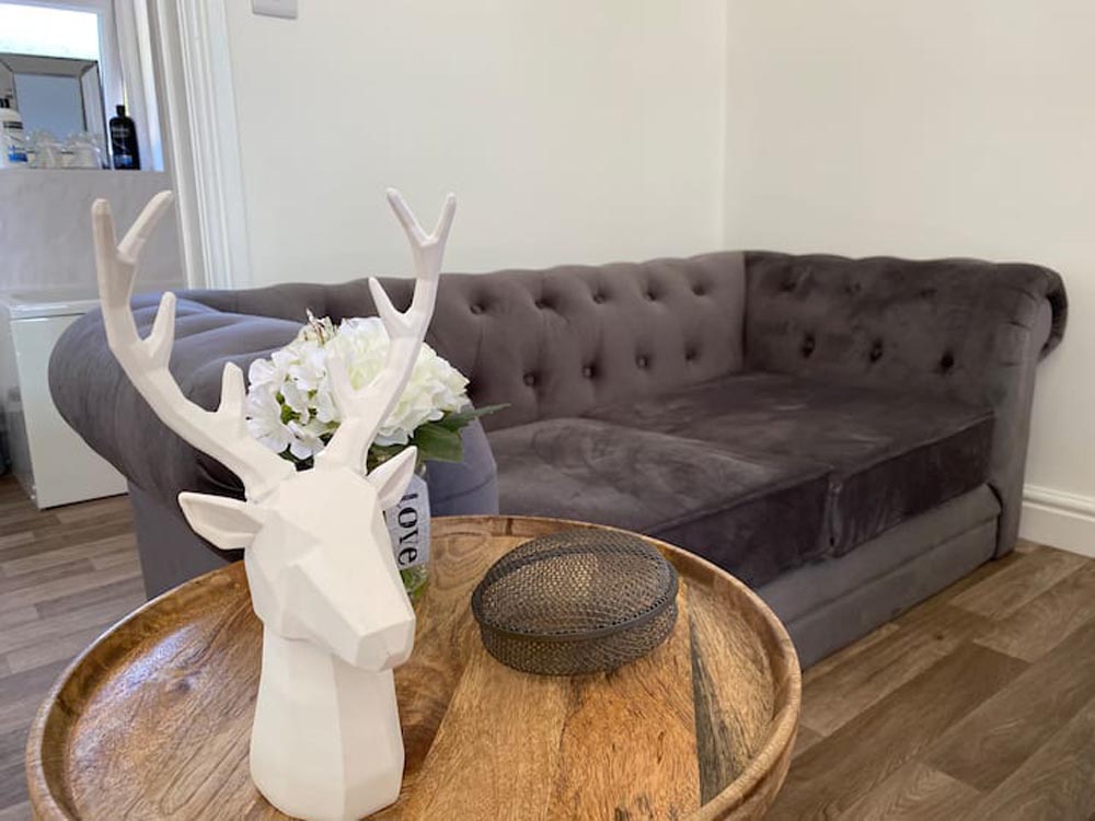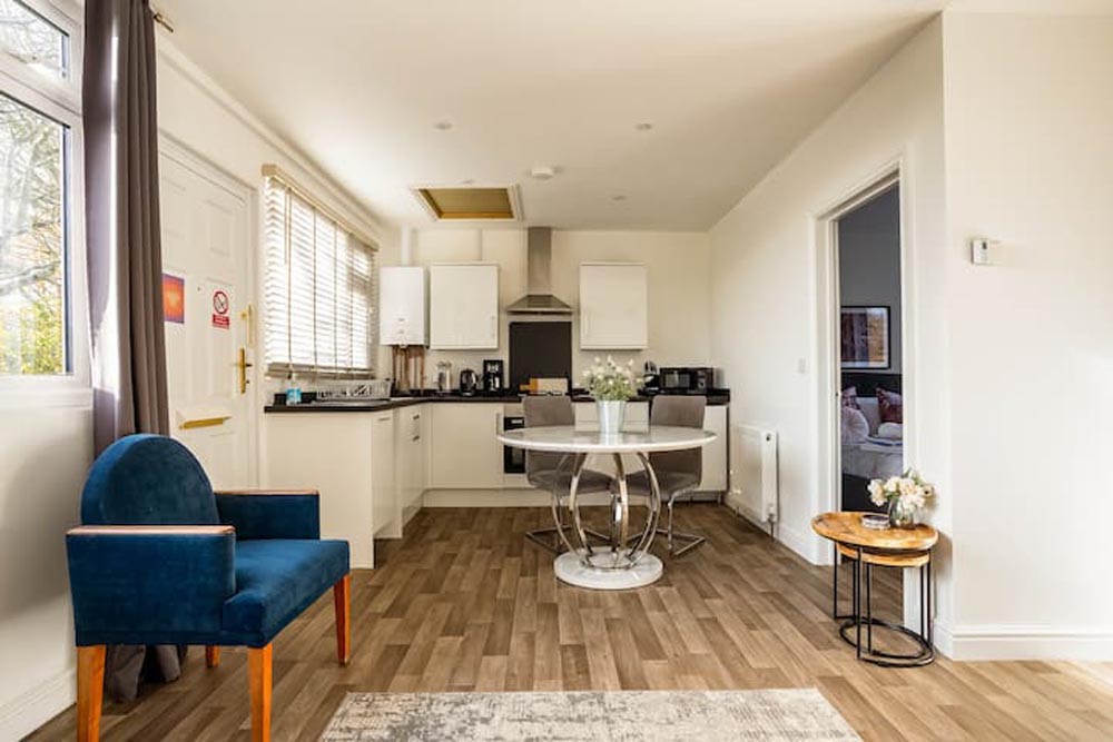 - Kitchen/diner/living area: the kitchen is fully equipped with an electric hob and oven; microwave; fridge; freezer; and coffee maker. It has everything you’d need to prepare meals on your self-catering holiday. The dining area has a table and chairs and there’s a seating area with a Freeview TV.